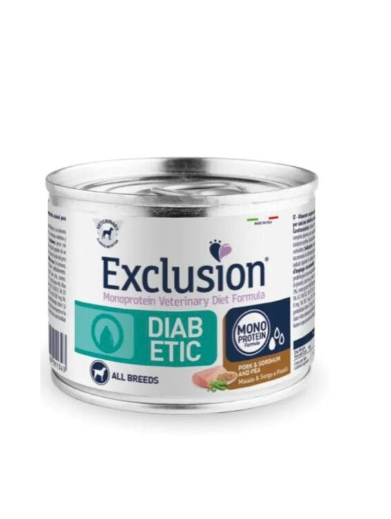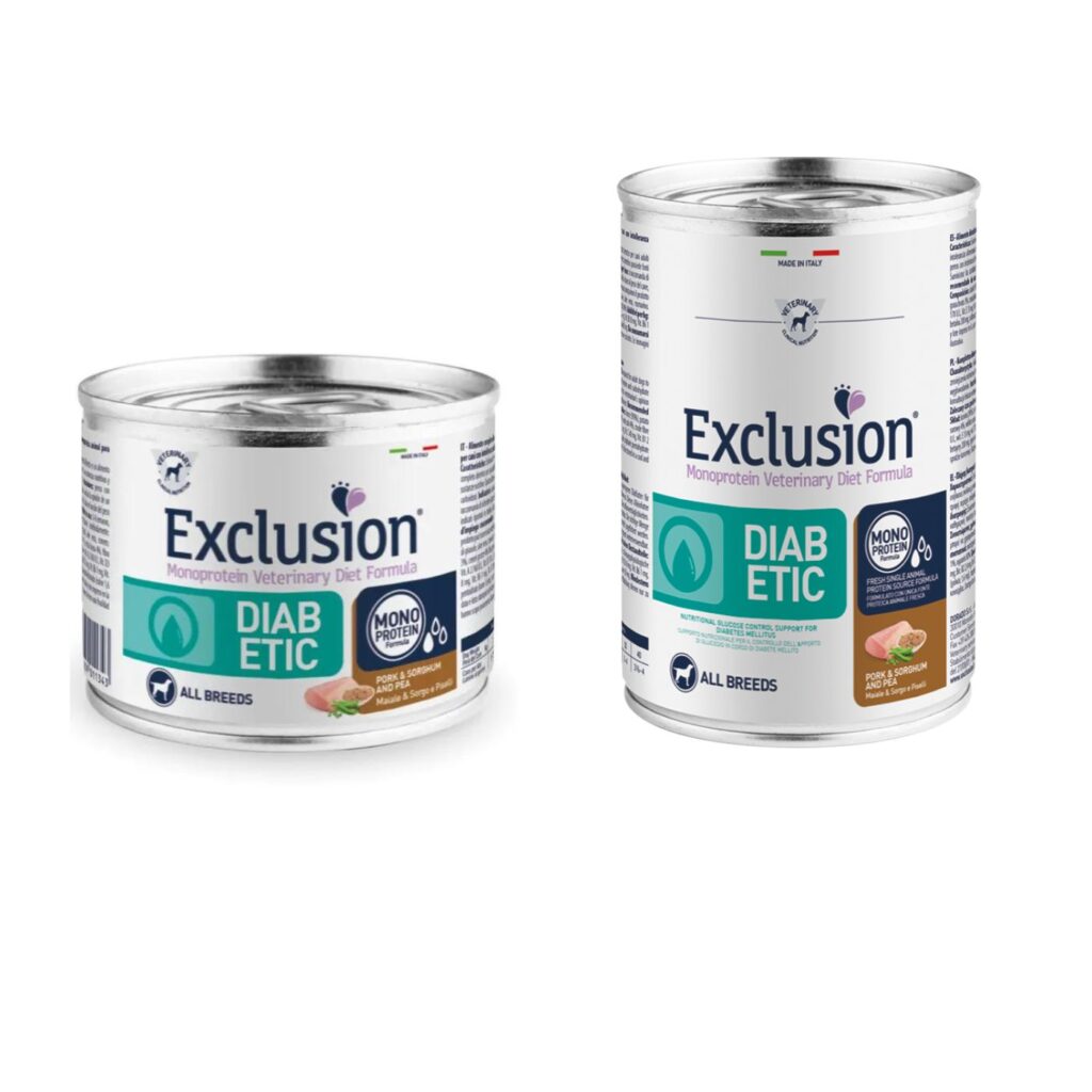 Exclusion Monoprotein Veterinary Diet Formula Diabetic è un alimento dietetico con formulazione monoproteica, realizzato con un’unica fonte alternativa di proteine animali, ingredienti innovativi e preservato con tocoferoli naturali; rappresenta la risposta nutrizionale a disposizione del Veterinario, differenziata per taglia, come supporto nutrizionale per il controllo dell’apporto di glucosio in corso di diabete mellito.